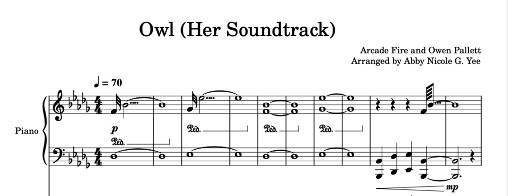 "Owl" by Arcade Fire and Owen Pallett sheet music for piano and violincello arranged by Abby Yee.